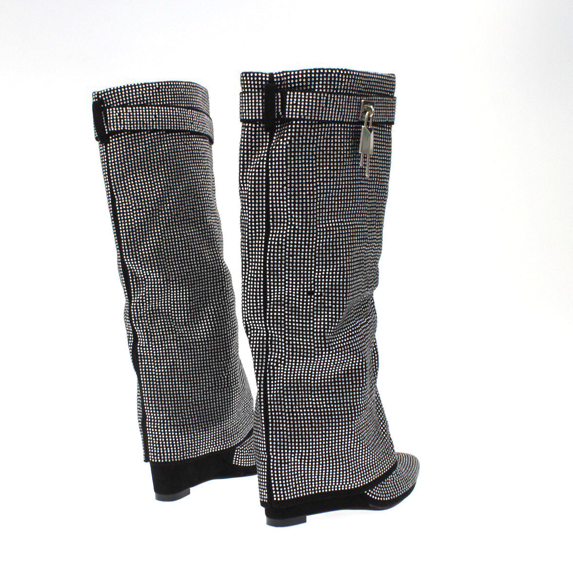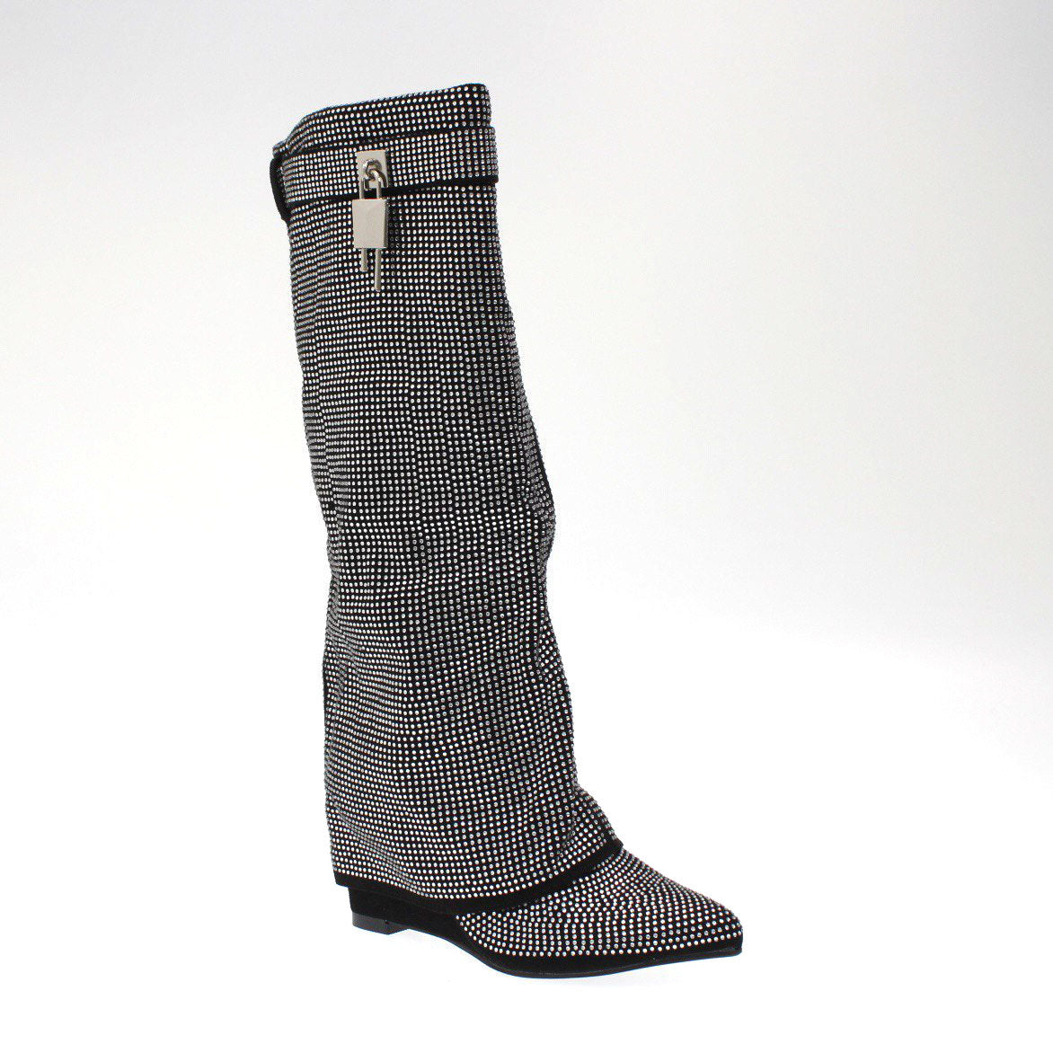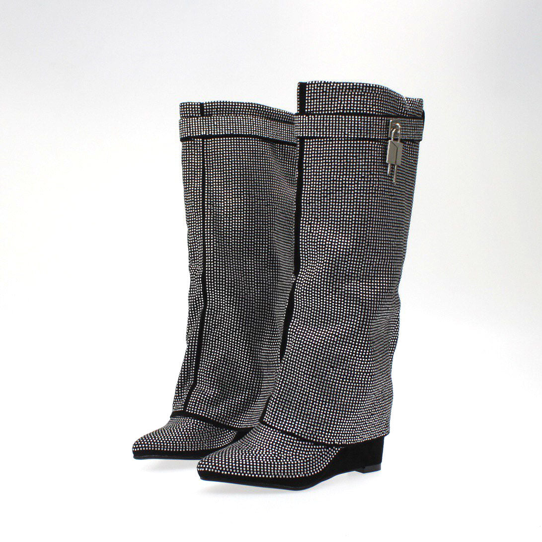 Stivale a punta in camoscio ricoperto interamente con strass , chiusura con cerniera laterale e zeppa di 8 cm