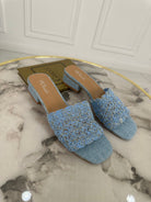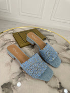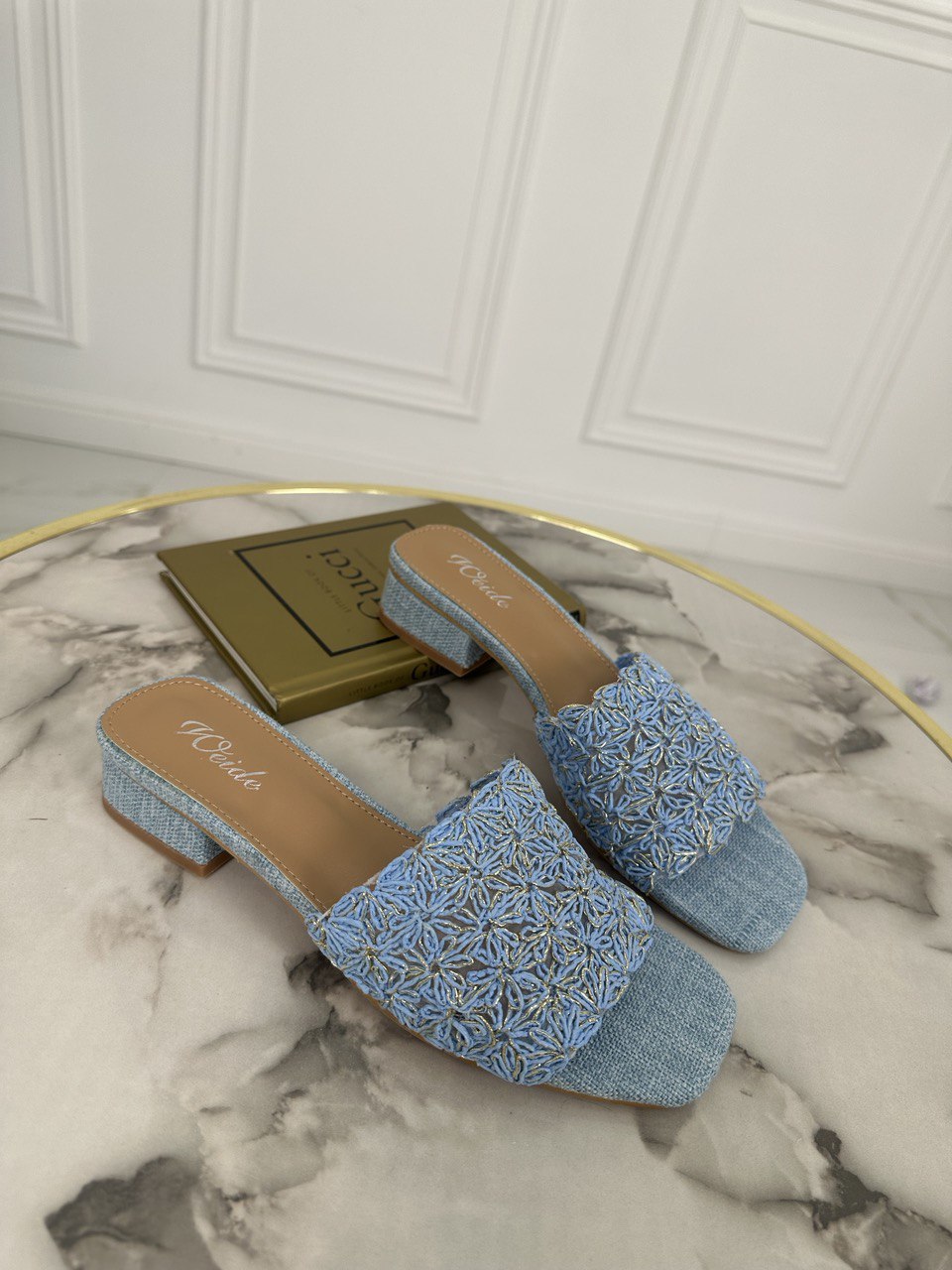 Pantofolina con fascia larga in tessuto , aperte sul retro con tacchetto di 2 cm