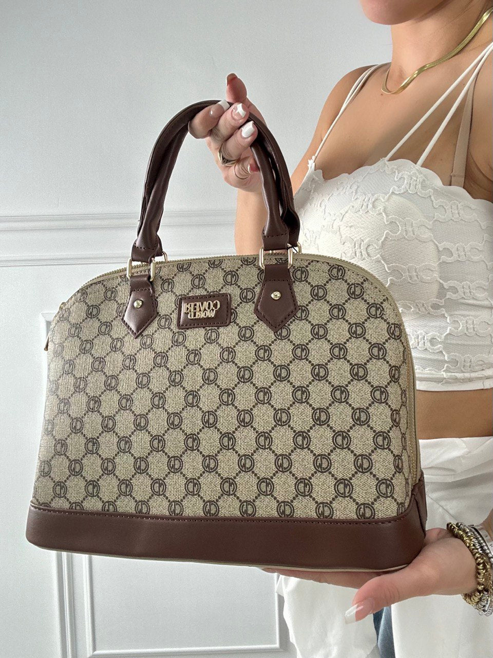 Borsa in ecopelle logata , chiusura con cerniera , manico da graccio e tracolla da spalla removibile.