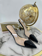 Decolletè con trasparenze con dettaglio in ecopelle a cuore sulla punta , interno in ecopelle , chiusura con cinturino e tacco a rocchetto di 7 cm
