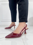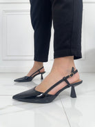 Decolletè in vernice con interno in ecopelle , aperte sul retro , chiusura con cinturino regolabile e tacco di 6 cm