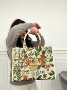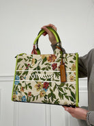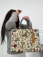 Borsa in tessuto , chiusura con cerniera , manico da braccio e tracolla da spalla removibile.