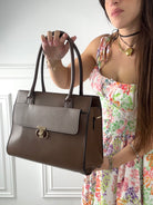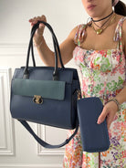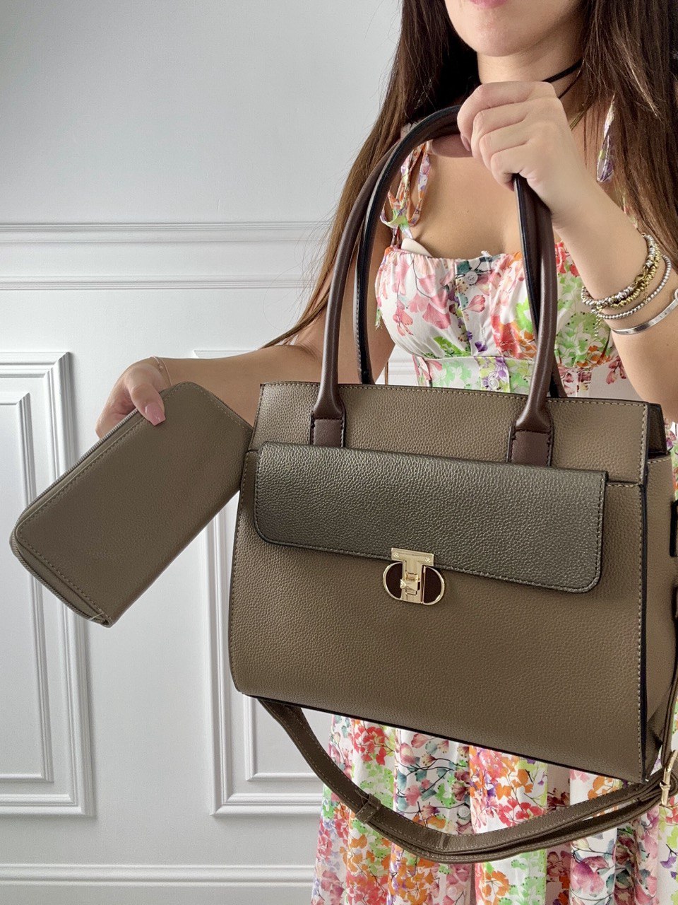 Borsa in ecopelle con finta tasca sul davanti , tasca sul retro , chiusura con cerniera , manico da braccio e varie tasche interne , con portafoglio e tracolla da spalla removibile.