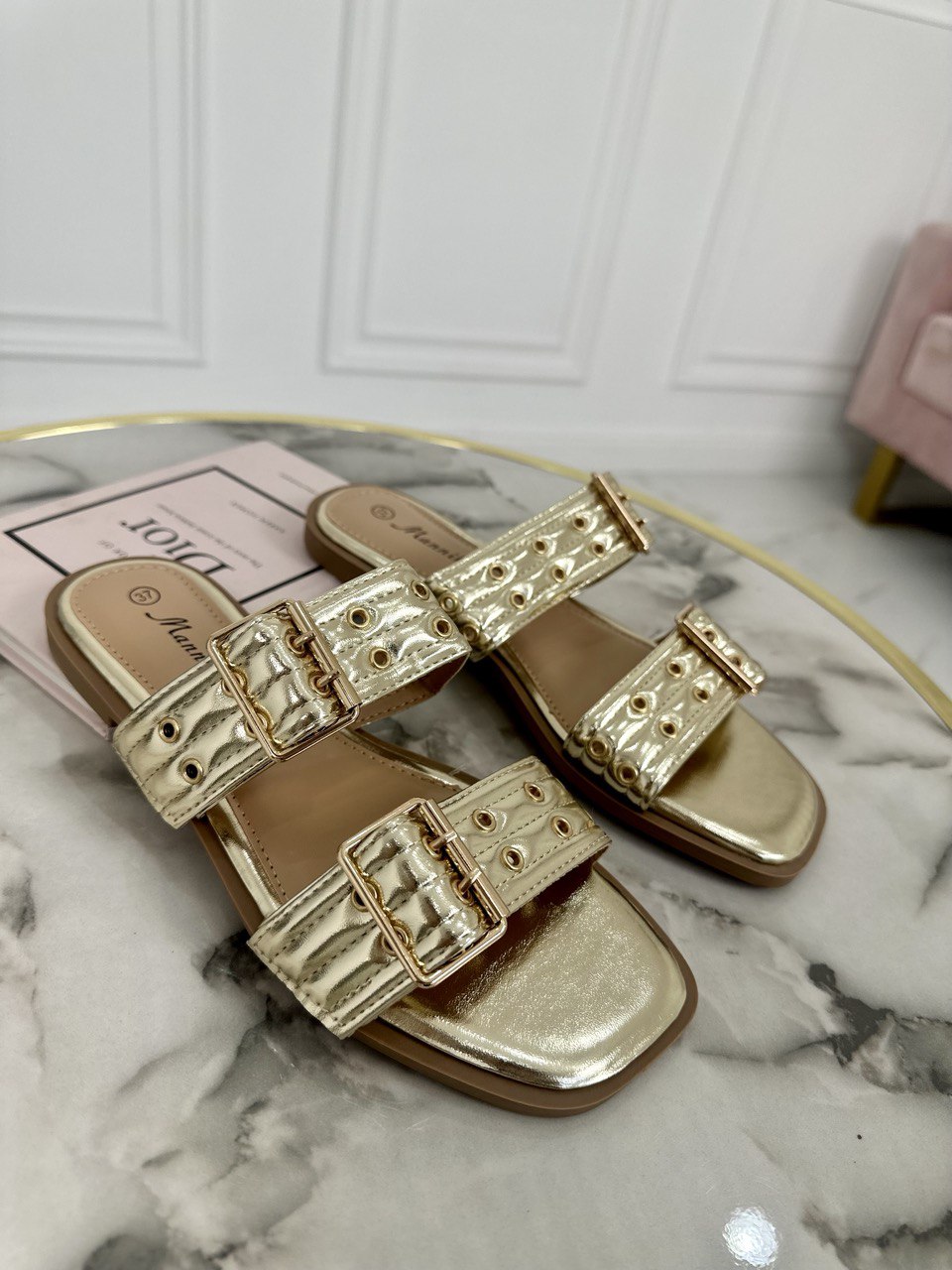 Pantofolina in ecopelle con fasce larghe regolabili con fibbia , aperte sul retro con fondo in gomma