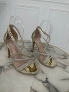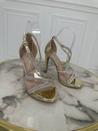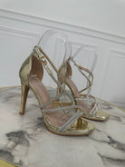 Sandali in ecopelle con fasce sottili ad incrocio ricoperte di strass , chiusura con cinturino e tacco a spillo di 10 cm